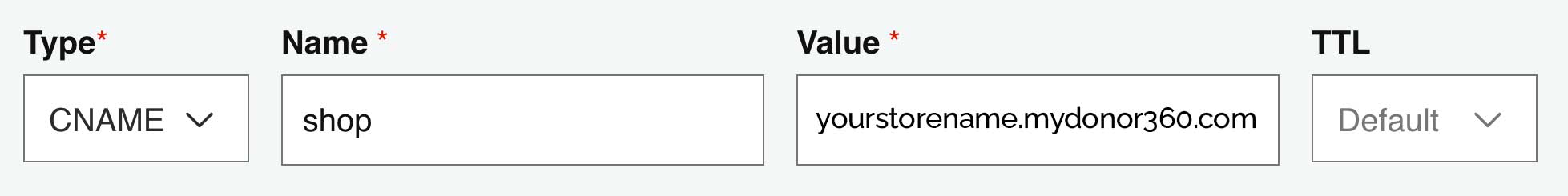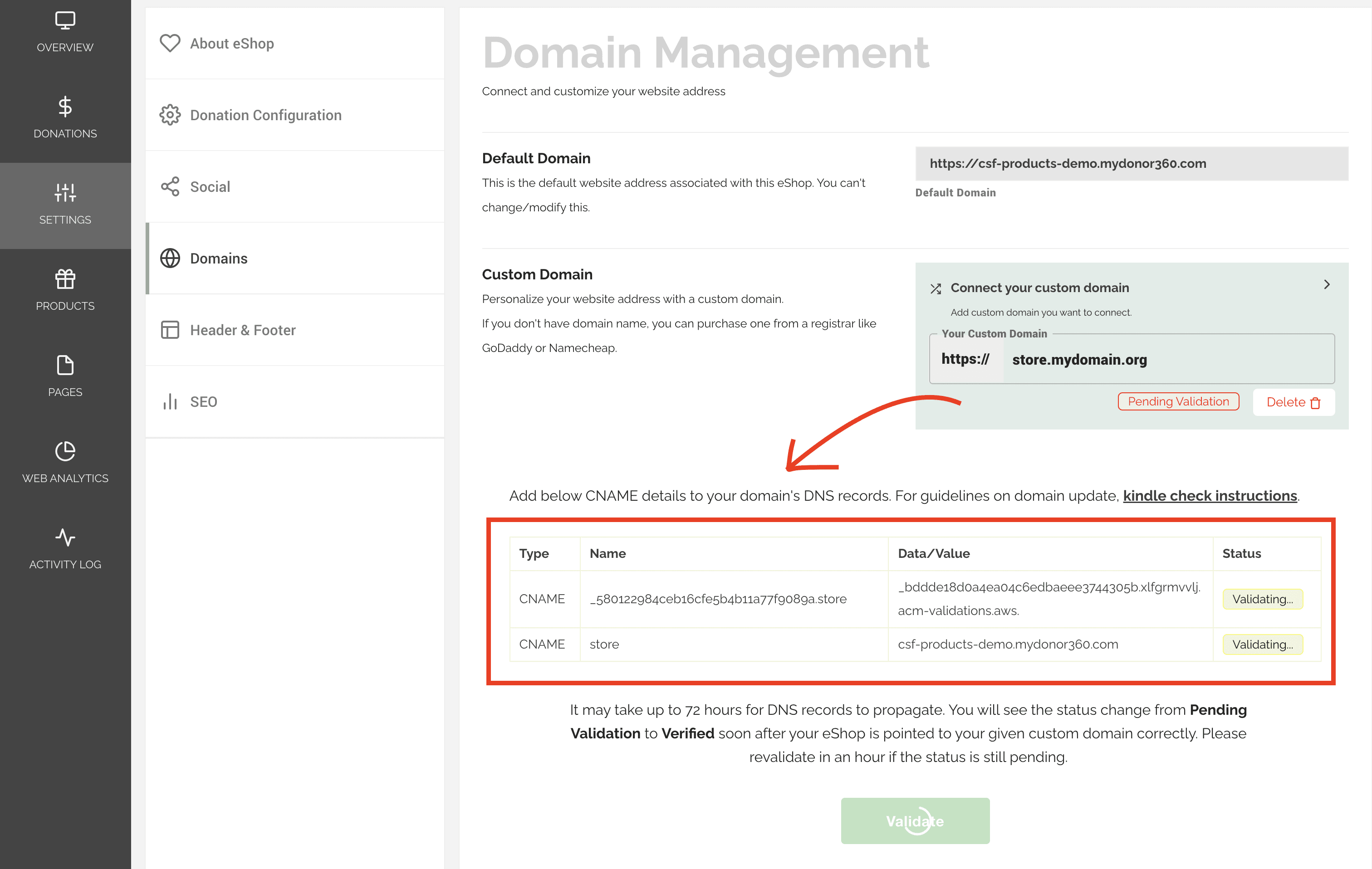 Next, add the two CNAME records shown above to your website domain's DNS settings. This will connect your custom domain to your Donor360 eShop.